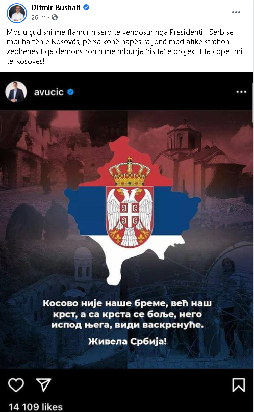 “Mos u çudisni me flamurin serb të vendosur nga Presidenti i Serbisë mbi hartën e Kosovës, përsa kohë hapësira jonë mediatike strehon zëdhënësit që demonstronin me mburrje ‘risitë’ e projektit të copëtimit të Kosovës!”, shkruan Bushati.