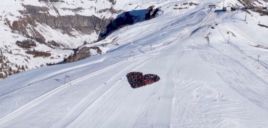 Dhjetëra skiatorë krijuan një zemër në shpatet e Crans-Montana për të vajtuar viktimat e zjarrit vdekjeprurës në bar në natën e Vitit të Ri.