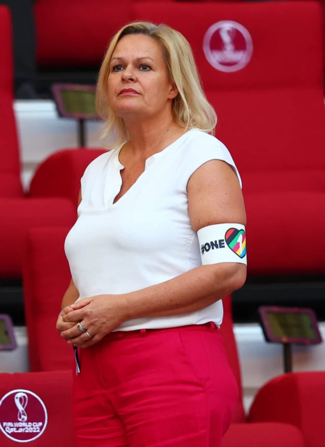 Nancy Faeser mbante shiritin “One Love” dhe u ul pranë presidentit të FIFA-s, Gianni Infantino, i cili në 24 orët e mëparshme bëri me dije se ata futbollistë që sfidojnë ndalimin e shiritit do të ndëshkohen me karton të verdhë në fillimi i ndeshjes.