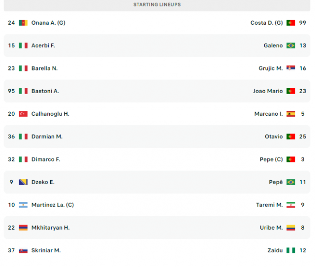 Inter: Onana; Skriniar, Acerbi, Bastoni; Darmian, Barella, Calhanoglu, Mkhitaryan, Dimarco; Dzeko, Lautaro Martinez.