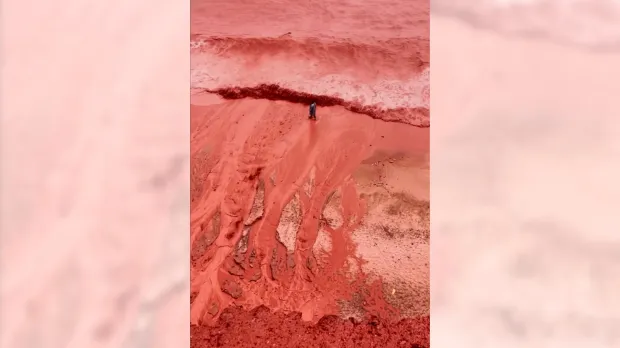 Reshjet e shiut në ishullin Hormuz të Iranit e kanë transformuar përkohësisht vijën bregdetare në një pamje mbresëlënëse natyrore me nuanca të kuqe. Plazhi është i njohur për rërën dhe shkëmbinjtë e tij me ngjyrë të kuqe të theksuar, të krijuara nga përqendrimet e larta të oksidit të hekurit. Sa herë që bie shi, siç ndodhi këtë javë, rrjedha të tokës së kuqe zbresin drejt bregut, duke ngjyrosur plazhin dhe ujërat përreth, në kontrast të fortë me blunë e Gjirit Persik.