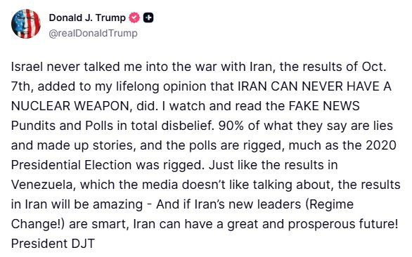 “Izraeli nuk më bindi kurrë të hyja në luftë me Iranin, rezultatet e 7 tetorit më shtuan mendimin tim të përjetshëm se Irani nuk mund të ketë kurrë një armë bërthamore. I shikoj dhe i lexoj ekspertët dhe sondazhet për lajmet e rreme me mosbesim të plotë. 90% e asaj që thonë janë gënjeshtra dhe histori të sajuara, dhe sondazhet janë të manipuluara, ashtu siç u manipuluan zgjedhjet presidenciale të vitit 2020. Ashtu si rezultatet në Venezuelë, për të cilat media nuk i pëlqen të flasë, rezultatet në Iran do të jenë të mahnitshme – Dhe nëse udhëheqësit e rinj të Iranit (Ndryshimi i Regjimit!) janë të zgjuar, Irani mund të ketë një të ardhme të shkëlqyer dhe të begatë! Presidenti DJT”, shkruan Trump./abcnews.al