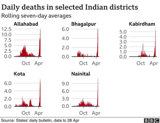 Rreth 32% e 614 e viktimave të raportuara u shënuan në Prill. Yogi Adityanath, kryetari i qytetit tha se nuk kishte mungesë të ilaçeve, shtretërve spitalorë ose oksigjenit, por ekspertët thonë se realiteti është i kundërt.