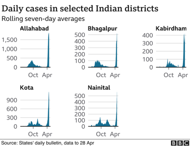 Bhagalpur është një nga vendet më të prekura në Indi. Vendi ka regjistruar një rritje prej 26% që nga 20 Prilli, dhe numri i viktimave është rritur me 33% . Një zyrtar i lartë nga spitali tha për BBC se nga 220 mjekë, 40 kishin rezultuar pozitivë në 10 ditët e fundit dhe katër prej tyre vdiqën.