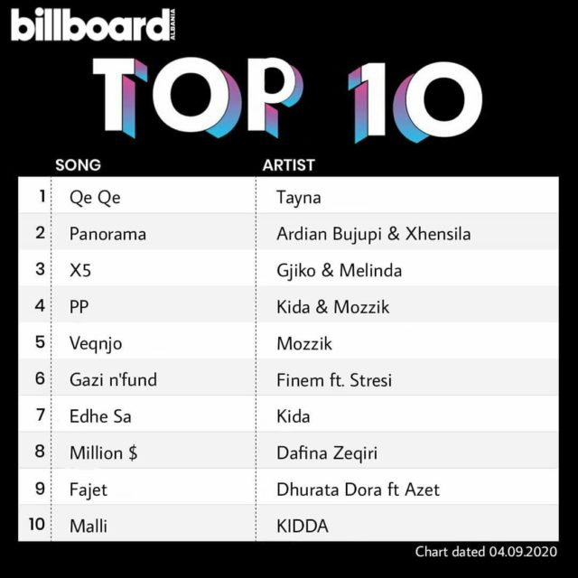 Ndërkaq, prurje e re në listë është dhe kënga më e fundit e Kidës “Edhe Sa”, e cila ashtu si çdo projekt i këngëtares u prit shumë mirë nga publiku. Stresi së bashku me Finem, Dafina Zeqiri, Dhurata Dora me duetin me Azet si dhe KIDDA me “Malli”, janë renditur sërish si më të dëgjuarat. xh.d/abcnews.al