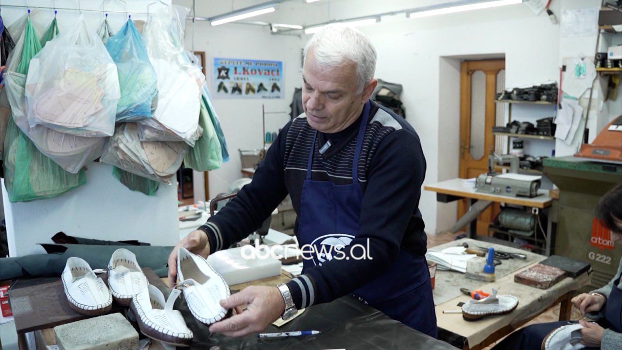 Në dorë ka një palë këpucë tipike tradicionale të Kukësit. Ky zanat është i vështirë thotë Isufi, por ka arritur ta marrë në kohë dhe e mban ende.