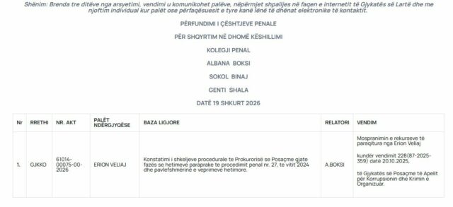 “Mospranimin e rekurseve të paraqitura nga Erion Veliaj kundër vendimit 228(87-2025-359) datë 20.10.2025, të Gjykatës së Posaçme të Apelit për Korrupsionin dhe Krimin e Organizuar”, thuhet në vendim.