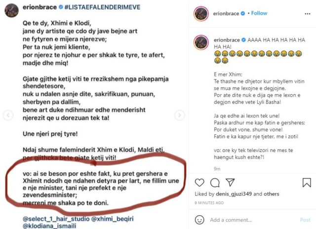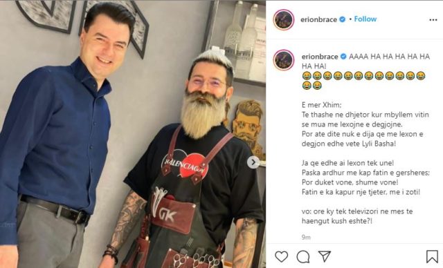 Por pas Xhimi publikoi sot foton me kryedemokratin, Braçe reagoi me ironi duke shkruar se Basha ka shkuar të marrë fatin e gërshërës, por shton se është me vonesë, pasi “fatin e ka kapur një tjetër më i zoti” duke nënkuptuar se aty është qethur më herët edhe kryeministri Edi Rama.