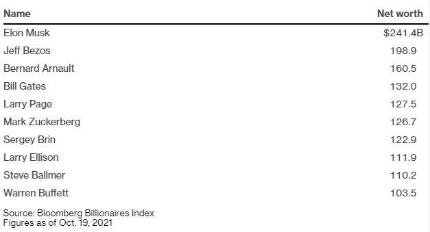 Sipas listës së Bloomberg, Musk është njeriu më i pasur në planet me një pasuri prej 241.4 miliardë dollarë. Pasohet nga Jeff Bezos me 198.9 miliardë dollarë dhe Bernard Arno me 160.5 miliardë dollarë./ db/Abcnews.al