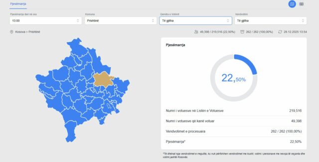 Në kryeqytetin Prishtinë, deri në këtë orë votuan 21.51% e qytetarëve me të drejtë vote.