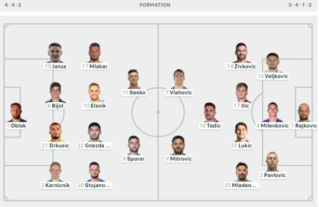 Sa i përket formacioneve, tekniku Matjaz Kek i ka rreshtuar të tijët me formulën 4-4-2, ku në portë është vendosur Jan Oblak. Në krahët e mbrojtjes janë Janza e Karnicnik, me qendrën që mbulohet nga Bijol e Drkusic. Mesfusha me katër përbëhet nga Mlakar, Elsnik, Gnezda Cerin e Stojanovic, ndërsa në sulm janë pozicionuar Sporar dhe talenti i sulmit, Benjamin Sesko.