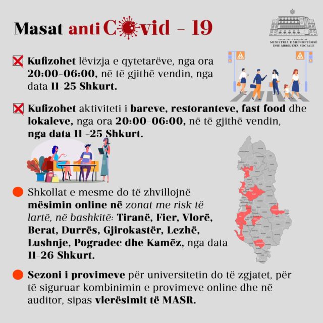 Sa i përket shkollave të mesme, mësimi do të kalojë online deri më datë 25 shkurt në rrethet: Tiranë, Fier, Vlorë, Berat, Durrës, Gjirokastër, Lezhë, Lushnje, Pogradec dhe Kamëz duke aplikuar kështu skenarin nr.3 të protokollit të sigurisë të miratuar nga Ministria e Arsimit dhe ajo e Shëndetësisë.