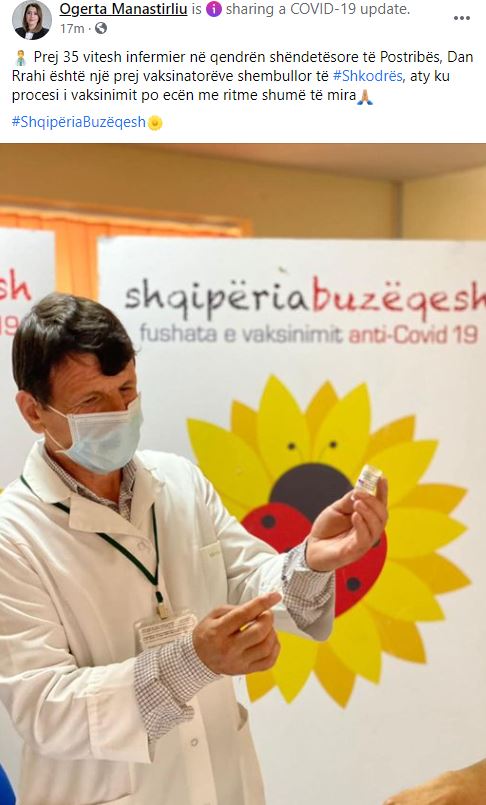 “Prej 35 vitesh infermier në qendrën shëndetësore të Postribës, Dan Rrahi është një prej vaksinatorëve shembullor të Shkodrës aty ku procesi i vaksinimit po ecën me ritme shumë të mira”, shkruan ministrja. /mv.abcnews.al