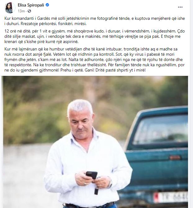 “Kur më lajmëruan që ke humbur vetëdijen dhe të kanë intubuar, tronditja ishte aq e madhe sa nuk nxorra dot asnjë fjalë. Vetëm lot që rridhnin pa kontroll. Sot, që ky virus i pabesë të mori frymën dhe jetën, s’kam më as lot. Nalta të adhuronte, çdo njëri nga ne që të njohu të donte dhe të respektonte. Na ke tronditur dhe trishtuar thellësisht. Për familjen tënde nuk ka ngushëllim, por ne do iu gjendemi gjithmonë! Prehu i qetë, Gani! Dritë pastë shpirti yt i mirë!”, shkruan Spiropali.