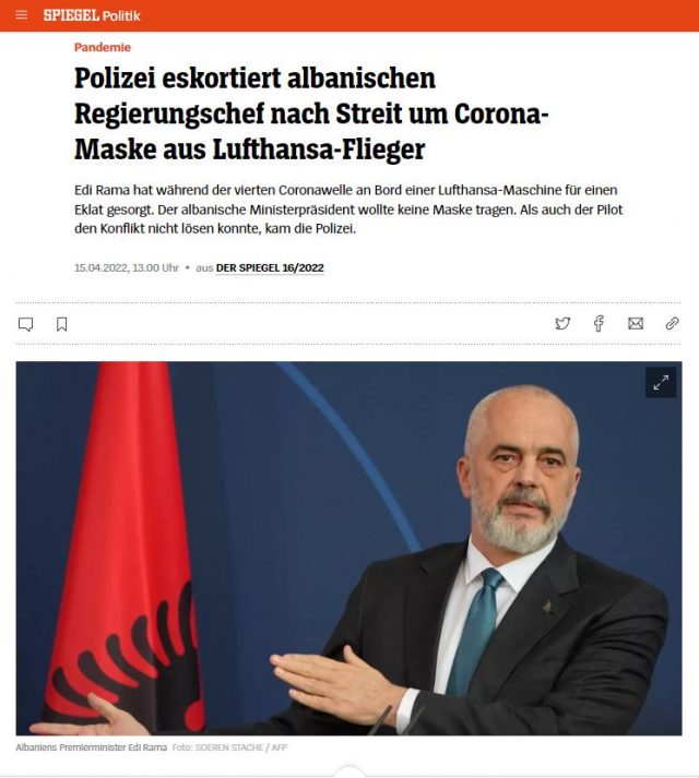 Kryeministri shqiptar Edi Rama shkaktoi një incident në bordin e avionit të Lufthansa gjatë valës së katërt të koronës. Sipas medias gjermane, Der Spiegel, ngjarja ka ndodhur në dhjetorin e një viti më parë, ku kreu i qeverisë shqiptare refuzoi me forcë mbajtjen e një maske mbrojtës për koronavirusin.