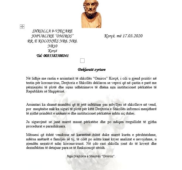 Me anë të një deklarate zyrtare, shkolla “Omiros” thotë se në fakt arsimtari mund të jetë infektuar pas mbylljes së shkollave në vend.