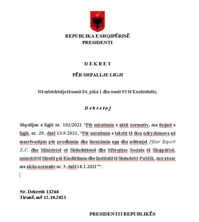 “Shpalljen e ligjit nr. 102/2021 “Për miratimin e aktit normativ, me fuqinë e ligjit, nr. 29, datë 13.9.2021, “Për miratimin e tekstit të disa ndryshimeve në marrëveshjen për prodhimin dhe furnizimin nga dhe ndërmjet Pfizer Export B.V. dhe Ministrisë së Shëndetësisë dhe Mbrojtjes Sociale të Shqipërisë, ministrit të Shtetit për Rindërtimin dhe Institutit të Shëndetit Publik, miratuar me aktin normativ nr. 3, datë 18.1.2021””, thuhet në dekret.
