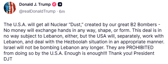 “SHBA-të do të marrin të gjithë “Pluhurin” Bërthamor të krijuar nga bombarduesit tanë të mëdhenj B2. Asnjë para nuk do të shkëmbehet në asnjë mënyrë, formë apo formë. Kjo marrëveshje nuk i nënshtrohet në asnjë mënyrë Libanit, por SHBA-të, veçmas, do të punojnë me Libanin dhe do të merren me situatën e Hezbollahut në një mënyrë të përshtatshme. Izraeli nuk do ta bombardojë më Libanin. Atyre u ndalohet ta bëjnë këtë nga SHBA-të. Mjaft më!!! Faleminderit! President DJT”, shktuan Trump në Truth Social./abcnews.al