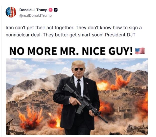 Me frazën “Mjaft me djem të mirë”, Trump publikoi një imazh simbolik ku shfaqet duke mbajtur një armë ushtarake, duke kritikuar Iranin për qëndrimet e tij.