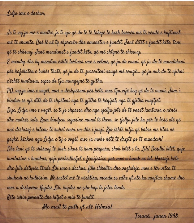 Para pushkatimit/ Hilmi Hysi i shkruan letër bijës së tij, ku i lë amanetet e fundit: “Tani që të shkruaj, të shoh sikur të kam përpara; shoh lotët e tu. Lidja! Derdhi lotët, qaje lumturinë e humbur, qaji përkëdheljet e fëmijërisë, por mos u humb në lot. Harroji këto dhe fillo detyrën tënde Lili (Lidja) ime e dashur, fillo shkollën dhe vazhdoje, mos e lër veten të shuhesh në hidhërim. Në rastet më të vështira, mendo se edhe yt atë ka vuajtur shumë dhe mos u dëshpëro. Kujdes Lili, kujdes në çdo hap të jetës tënde. Këto ishin porositë dhe lutjet e mia të fundit”.