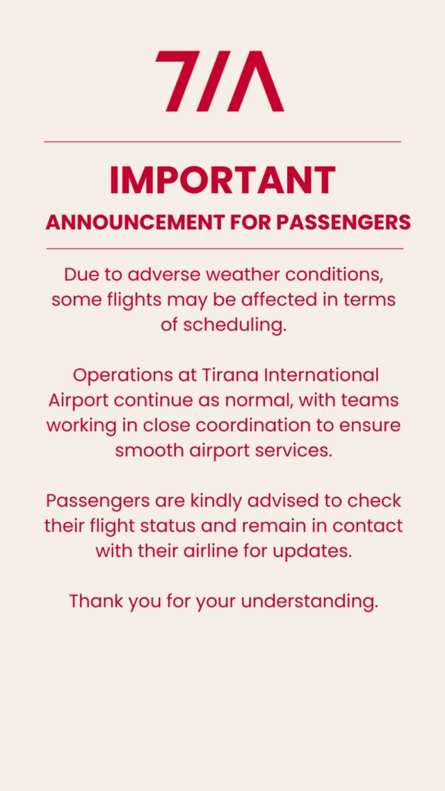 Operacionet në Aeroportin Ndërkombëtar të Tiranës vazhdojnë normalisht, me ekipet që punojnë në koordinim të ngushtë për të siguruar shërbime të qeta dhe pa probleme në aeroport.
