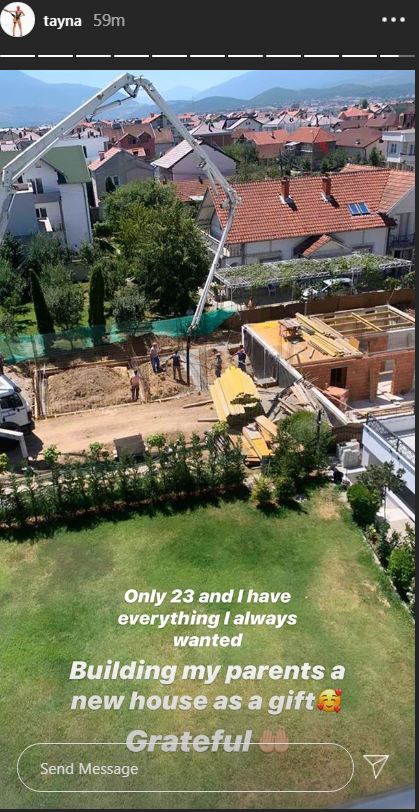 Lajmin e ka bërë të ditur vetë Tayna, përmes një Instastory, ku tregon se ka filluar ndërtimi i shtëpisë së re për prindërit e saj, që është dhuratë pikërisht nga ajo si shenjë falenderimi ndaj tyre.