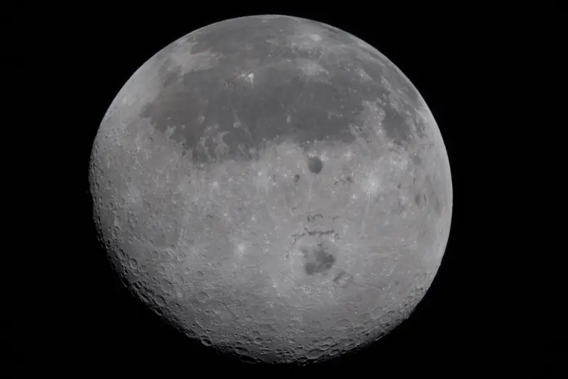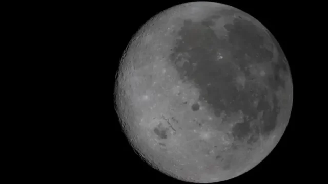Ana e afërt – hemisfera që shohim nga Toka – duket në anën e djathtë të fotografisë dhe është “e dallueshme nga njollat e errëta që mbulojnë sipërfaqen e saj. Këto janë rrjedha të lashta të lavës nga një kohë e hershme në historinë e Hënës, kur ajo ishte vullkanikisht aktive.