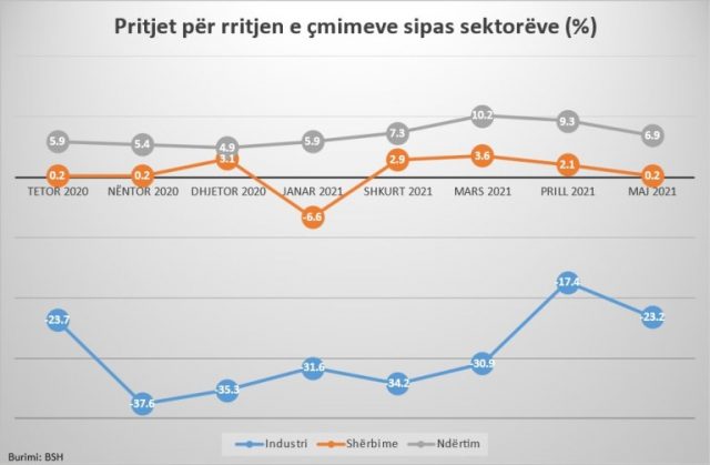 Pritshmëria për çmimet është veçanërisht negative në sektorin e industrisë. Për majin, treguesi që tregon balancën e pritjes së çmimeve për të ardhmen ishte negative me 23.2 pikë përqindje, në rënie të mëtejshme nga niveli 17.4% i muajit prill. Megjithatë, ky tregues është në nivele disi më të përmirësuara krahasuar me tremujorin e fundit 2020 dhe atë të parë të këtij viti, kur rënia kishte qenë më shumë se 30 pikë përqindje.