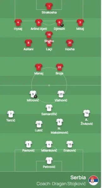 Formacioni i Serbisë (3-5-2): Petroviç, Erakoviç, Milenkoviç, Pavloviç, Zhivkoviç, Maksimoviç, Lukiç, Terziç, Vlahoviç, Mitroviç.