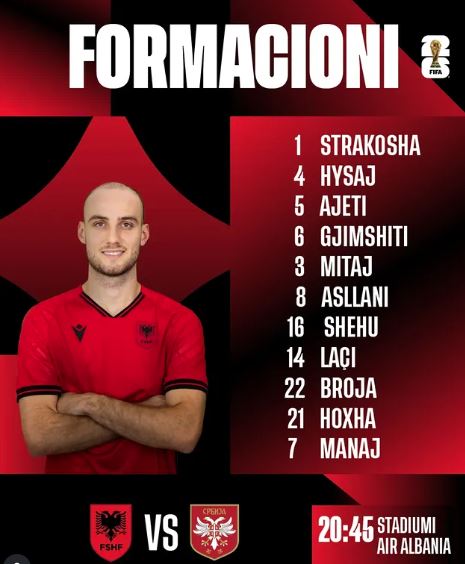 Formacioni Shqipërisë ndaj Serbisë (4-1-3-2): Strakosha, Hysaj, Ajeti, Gjimshiti, Mitaj, Shehu, Asllani, Laçi, Hoxha, Manaj, Broja.