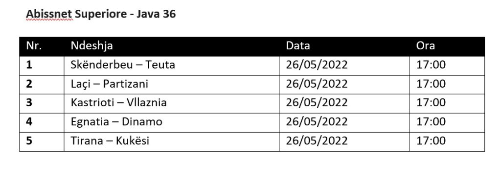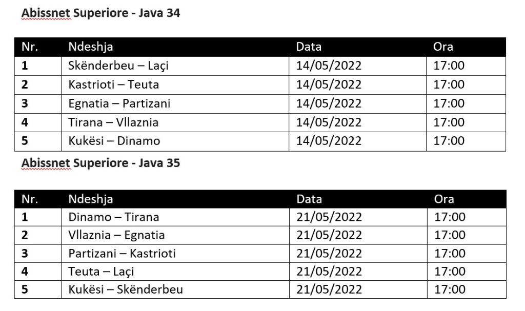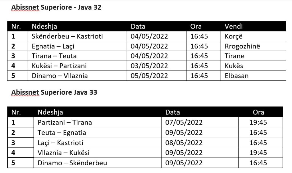 Më poshtë, edhe kalendari i ndeshjeve të kampionatit “Abissnet Superiore” nga java e 32-të e deri në javën e 36-të. / fshf.org