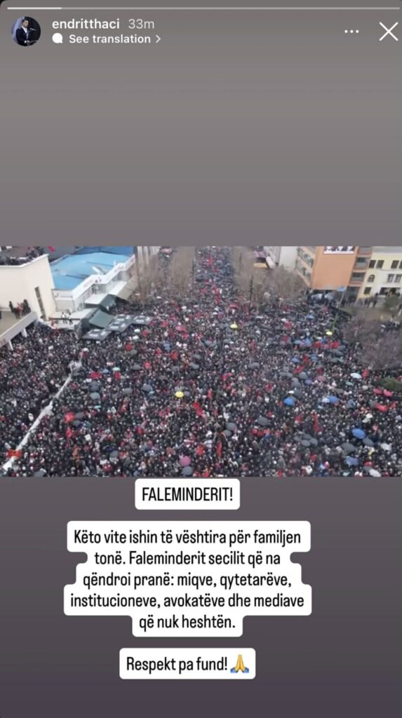 “Këto vite ishin të vështira për familjen tonë. Faleminderit secilit që na qëndroi pranë, miqve, qytetarëve, institucioneve, avokatëve dhe mediave që nuk heshtën. Respekt pa fund!”, shprehet ai.