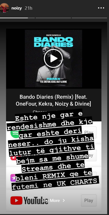 “Eshte nje garë e rendesishme dhe kjo garë eshte deri neser… do ju kisha lutur te gjitheve ti bejme sa me shume streams dhe te blejme REMIX qe te futemi ne UK CHARTS”, ka shkruar ai.