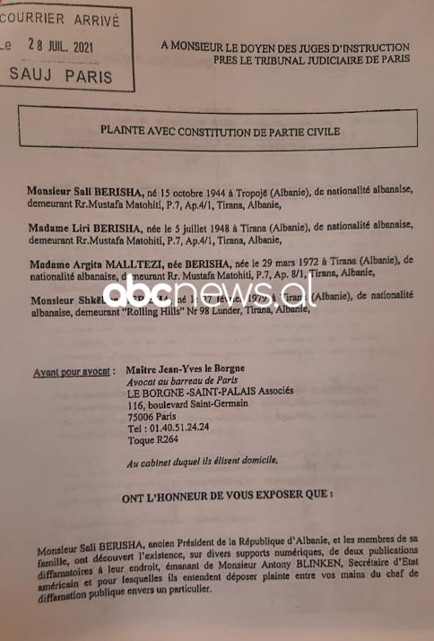 Berisha bëri me dije se pas njoftimit për shpalljen “non grata” nga Sekrerati i Shtetit Antony Blinken, ka dorëzuar në Gjykatën e Parisit padinë për shpifje ndaj këtij të fundit.