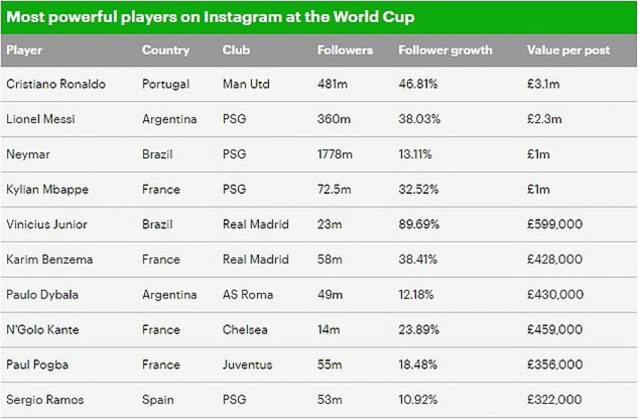 Kompania e statistikave “Nielsen Gracenote” ka bërë një analizë e cila ka vlerësuar numrin total të ndjekësve të lojtarëve, rritjen e ndjekësve në vitin e fundit, shkallën e angazhimit dhe vlerën mesatare të markës për postim në Instagram.