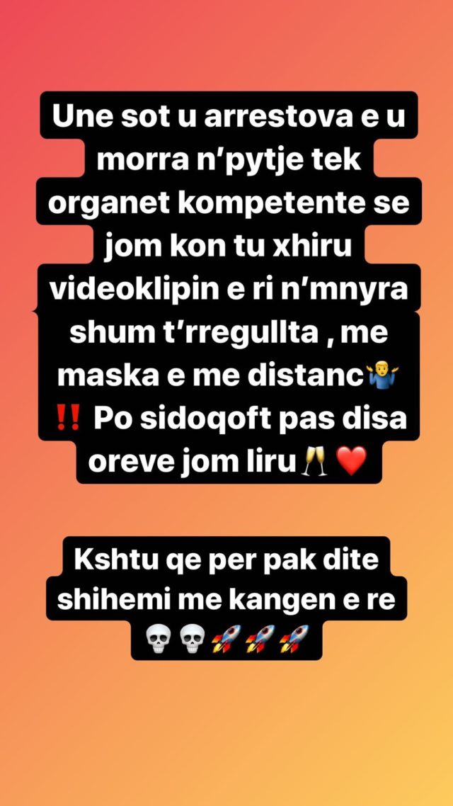 “Unë sot jam arrestuar e u mora në pyetje nga organet kompetente, sepse kam qenë duke xhiruar klipin e ri në mënyra shumë të rregullta, me maska dhe distance. Por sidoqoftë, pas disa orësh jam liruar. Kështu që për pak ditë shihemi me këngën e re”, ka shkruar Kastro./abcnews.al
