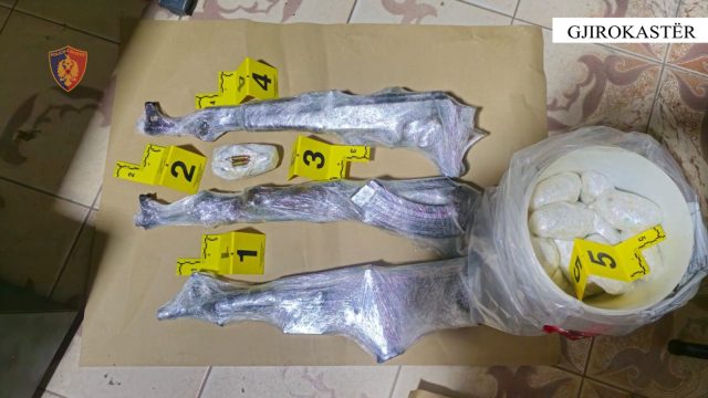 Në banesë u gjetën 2 kallashnikovë dhe një armë zjarri automatike, të dyshuar të trafikuar dhe qindra fishekë të kalibrave të ndryshëm.
