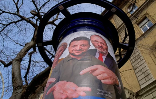 Billborde të vendosura në të gjithë vendin shfaqin imazhe të gjeneruara me inteligjencë artificiale të presidentit ukrainas, Volodymyr Zelensky, i rrethuar nga zyrtarë evropianë, duke zgjatur dorën sikur po kërkon para. Është një referencë jo shumë e fshehtë ndaj përpjekjeve të Bashkimit Evropian për ta ndihmuar financiarisht Ukrainën dhe për të forcuar mbrojtjen e saj, ndërsa lufta ka hyrë në vitin e pestë.