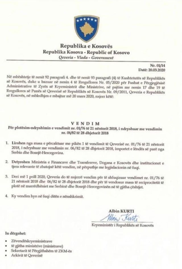 Qeveria e Kosovës ka hequr tarifën për lëndën e parë nga Serbia dhe Bosnja e Hercegovina. Vendimi u mor në mbledhjen e Qeverisë e cila është mbajtur në distancë për shkak të koronavirusit. Nga 1 prilli pritet që taksa të hiqet tërësisht.