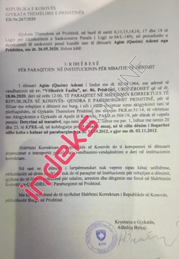 Mediat në Kosovë bëjnë me dijë se Gjykata e Prishtinës e ka urdhëruar Ademin që të paraqitet në qendrën e shlyerjes së dënimit, pra të shkojë në burg, për të shlyer dënimin prej 9 muajsh të dhënë ndaj tij.