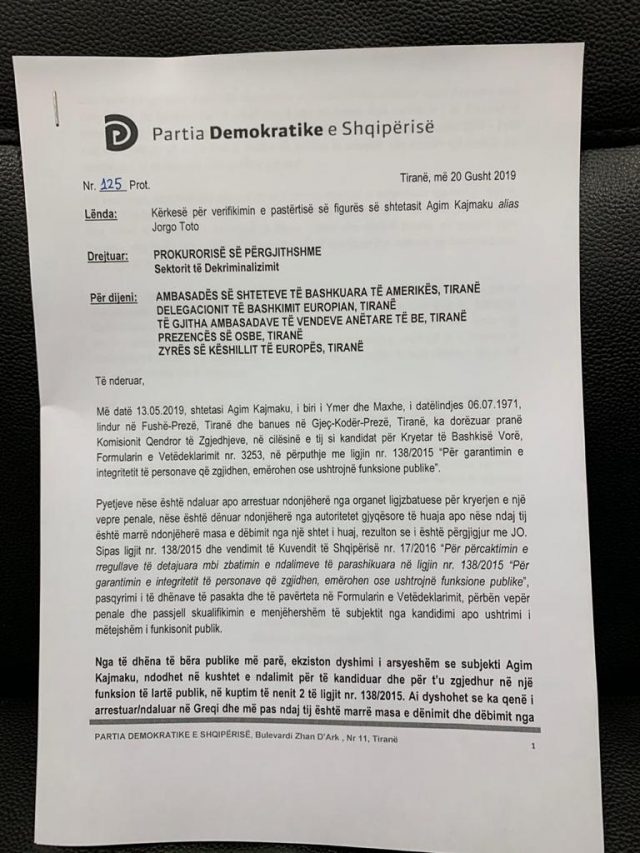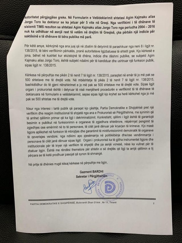 “Ai dyshhet se ka qenë i arrestuar/ndaluar në Greqi dhe, më pas, ndaj tij është marrë masa e dënimit dhe dëbimit nga autoritetet përgjegjëse greke” – thuhet në kërkesën e Sekretarit të Përgjithshëm të PD. Sipas Bardhit, kryebashkiaku socialist i Vorës Agim Kajmaku që në Greqi ka mbajtur identitetin Jorgo Toro nga periudha 2004 – 2016 nuk ka udhëtuar në asnjë rast të vetëm në drejtim të Greqisë, ndërkohë që në formularin e dekriminalizimit ka deklaruar se ka jetuar për 5 vite në këtë shtet./ABC News Albania 24/7
