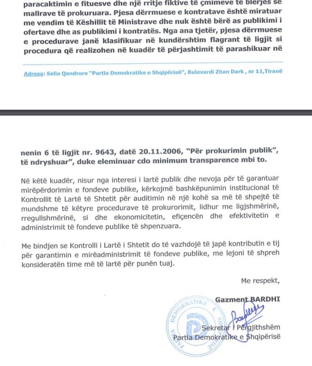 “Të gjitha këto procedura, për aq sa janë bërë publike, provojnë paracaktimin e fituesve dhe një rritje fiktive të çmimeve të blerjes së mallrave të prokuruara. Pjesa dërrmuese e kontratave është miratuar me vendim të Këshillit të Ministrave dhe nuk është bërë as publikimi i ofertave, as publikimi i kontratës.”- thuhet në kërkesën e firmosur nga Sekretari i Përgjithshëm i PD, Gazment Bardhi. Aty shpjegohet se pjesa dërrmuese e procedurave janë klasifikuar në kundërshtim flagrant të ligjit si procedura sekret, duke eleminuar çdo minimum transparence mbi to”.