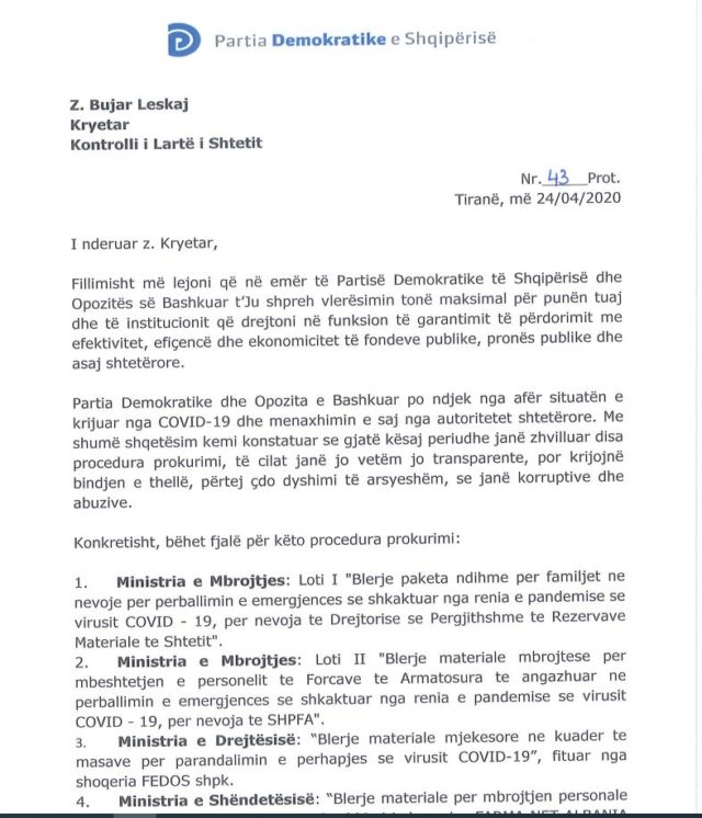 Partia Demokratike ka deklaruar më herët se me këto kontrata sekret, me çmime 2-3 herë më të larta se tregu, janë abuzuar miliona lekë, të cilat mund të ishin përdorur për të ndihmuar më shumë bizneset apo qytetarët në vështirësi të rënda ekonomike. Duke vënë në dukje interesin publik për garantimin e përdorimit të mirë të fondeve publike, Partia Demokratike kërkoi nga KLSH bashkëpunim për auditimin në një kohë sa më të shpejtë të mundshme të këtyre procedurave të prokurimit”, shkruan PD.