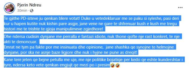 “Te gjithe PD-isteve ju qenkan blere votat! Duke u vetedeklaruar me se paku si syleshe, pasi deri kur u hapen kutite nuk kishin pare asgje, jane vene ne gare te shfrenuar kush e kush me tregu histori me te trishte te gjoja manipulimeve zgjedhore! Dhe ndersa cudisin dynjane me perralla e fantazi idiote, nuk thone qofte nje rast konkret, te nje akti te denoncuar.