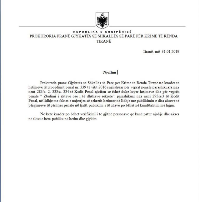Përmes një njoftimi zyrtar, Prokuroria për Krimet e Rënda bëri të ditur se po kryen hetime për “zbulim i akteve ose i të dhënave sekrete” për publikimin e disa akteve të përgjimeve të kryera për llogari procedimit penal 339 të vitit 2016. Sipas organit të hetimit, publikimi i akteve po bëhet në kundështim me ligjin.