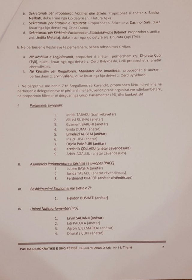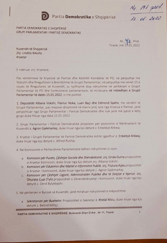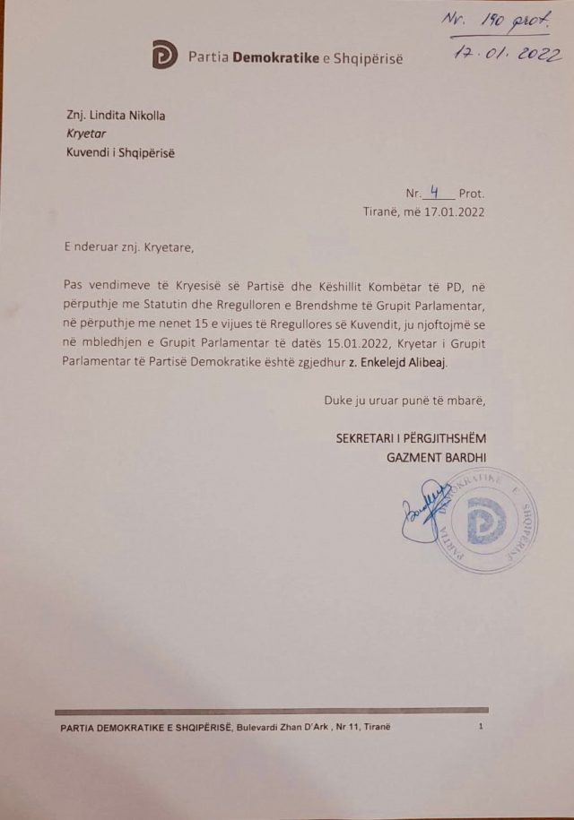 Përmes shkresës Basha ka vënë në dijeni Kuvendin për zgjedhjen e Enkelejd Alibeajt në postin e kryetarit të grupit parlamentar të PD duke zëvendësuar në këtë post Alfred Rrushajn.