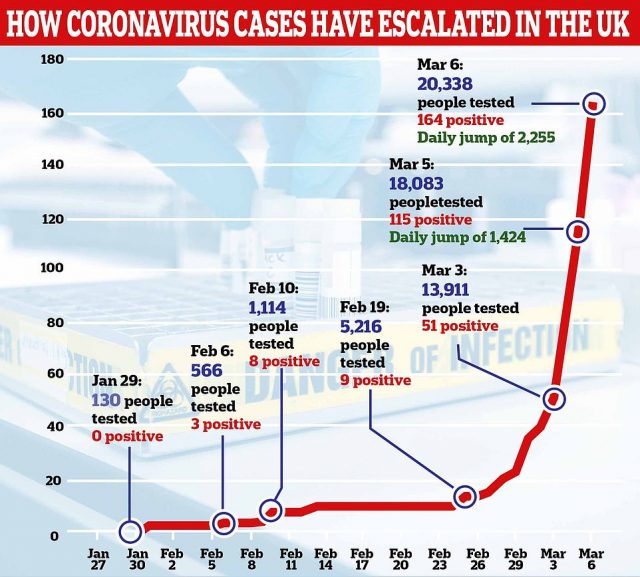 Britania e Madhe ka shënuar 164 raste pozitive me koronavirus, ndërsa 2 persona kanë vdekur. Pas rasteve të para me koronavirus, qeveria britanike ka hartua një plan kombëtar të reagimit, e cila fillon nga sensibilizimi i publikut deri tek trajtimi i të sëmurëve dhe menaxhimi i krizës në përgjithësi.