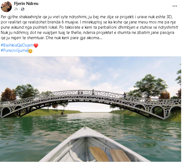 Kryebashkiaku i Lezhës Pjerin Ndreu i është përgjigjur akuzave në lidhje me projektin e prezantuar prej ti në rrjetet sociale për ndërtimin e urave në këtë qytet. Ndreu shkruan se ky projekt nuk është 3D, por pritet të realizohet brenda 6 muajsh. Ai ironizon duke shtuar se ata që tallen me këtë projekt, duhet të përballojnë dhimbjen e stuhisë së ndryshimit.