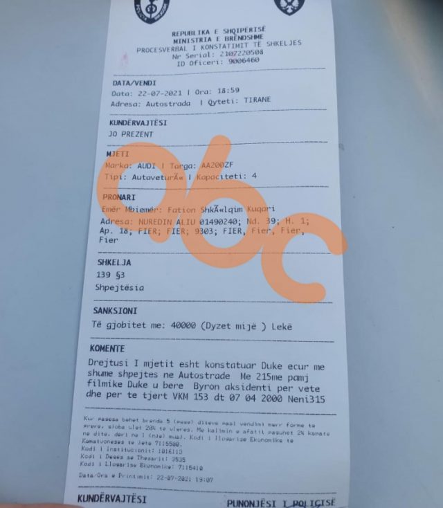 Gjoba ndaj Kuqarit,vjen në një kohë kur policia vijon aksionet për ndëshkimin e shoferëve të pabindur dhe sensibilizimin e të rinjve që shkelin rregullat duke u kthyer në rrezik për veten dhe të tjerët. /abcnews.al/