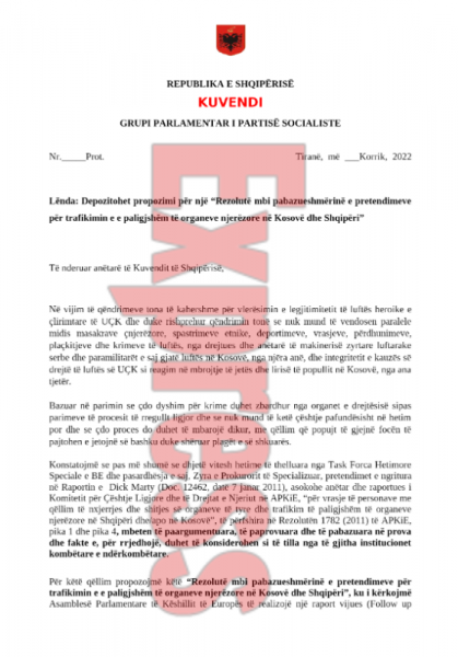 Një muaj pas vizitës së Qeverisë së Shqipërisë në Kosovë në krye me Edi Ramën, i cili paralajmëroi se Tirana, do të nisë një fushatë që do të përfshijë Uashingtonin, Parisin, Berlinin e qendra tjera të botës, për t’a dokumentuar se Ushtria Clirimtare e Kosovës s’ka qenë e përfshirë në trafikim organesh, ka lëvizur Partia Socialiste e Shqipërisë. Ky subjekt politik që drejtohet nga Rama ka deponuar në Kuvendin e Shqipërisë një propozim për një “Rezolutë mbi pabazueshmërinë e pretendimeve për trafikimin e e paligjshëm të organeve njerëzore në Kosovë dhe Shqipëri” dhe tekstin e rezolutës me të cilën Shqipëria do të hedh poshtë pretendimet për trafikim organesh.